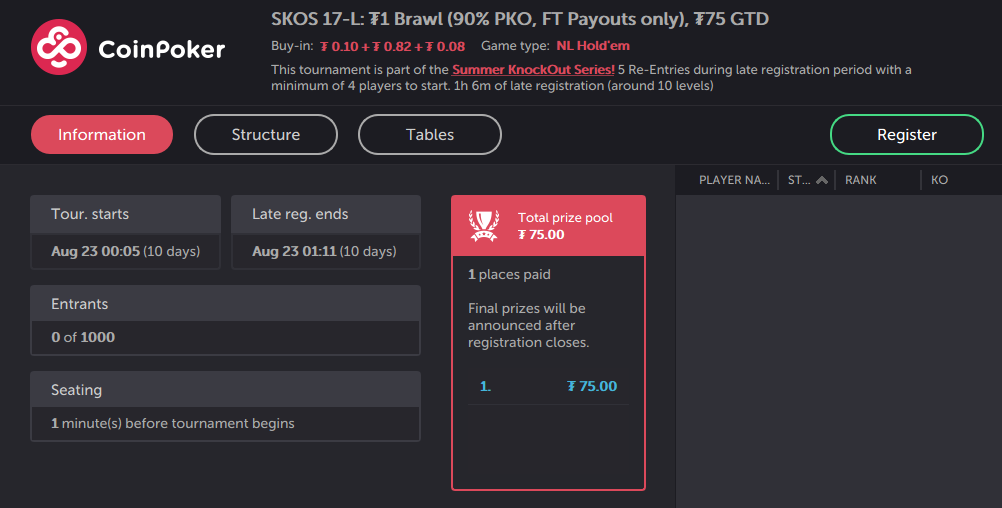 - SKOS 27-H: ₮200 Summer KO Series Main Event ₮50K Gtd — старт 25 августа в 22:05 МСК.