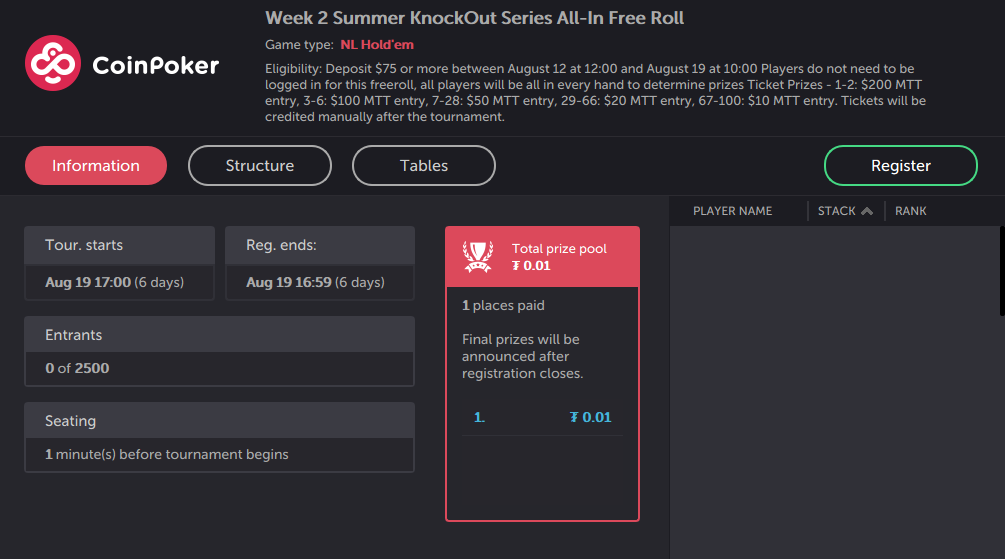 Фриролл стартует 19 августа в 15:00 МСК — в лобби он называется Week 2 Summer KnockOut Series All-In Free Roll.