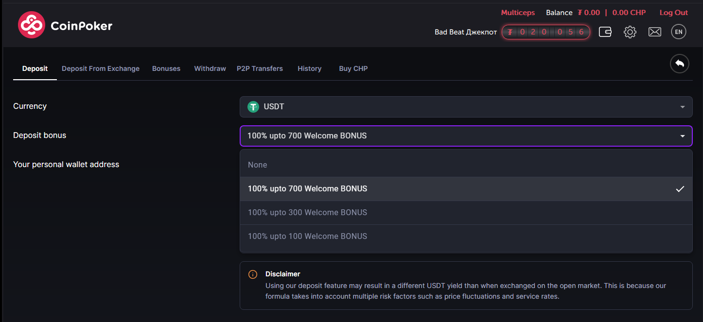 Найти бонусы можно в лобби CoinPoker —> нажать на кошелёк —> вкладки Deposit и Bonuses. Если вы не уверены в том, что сможете сами правильно активировать бонус — свяжитесь с менеджером Покерофф в Телеграме.