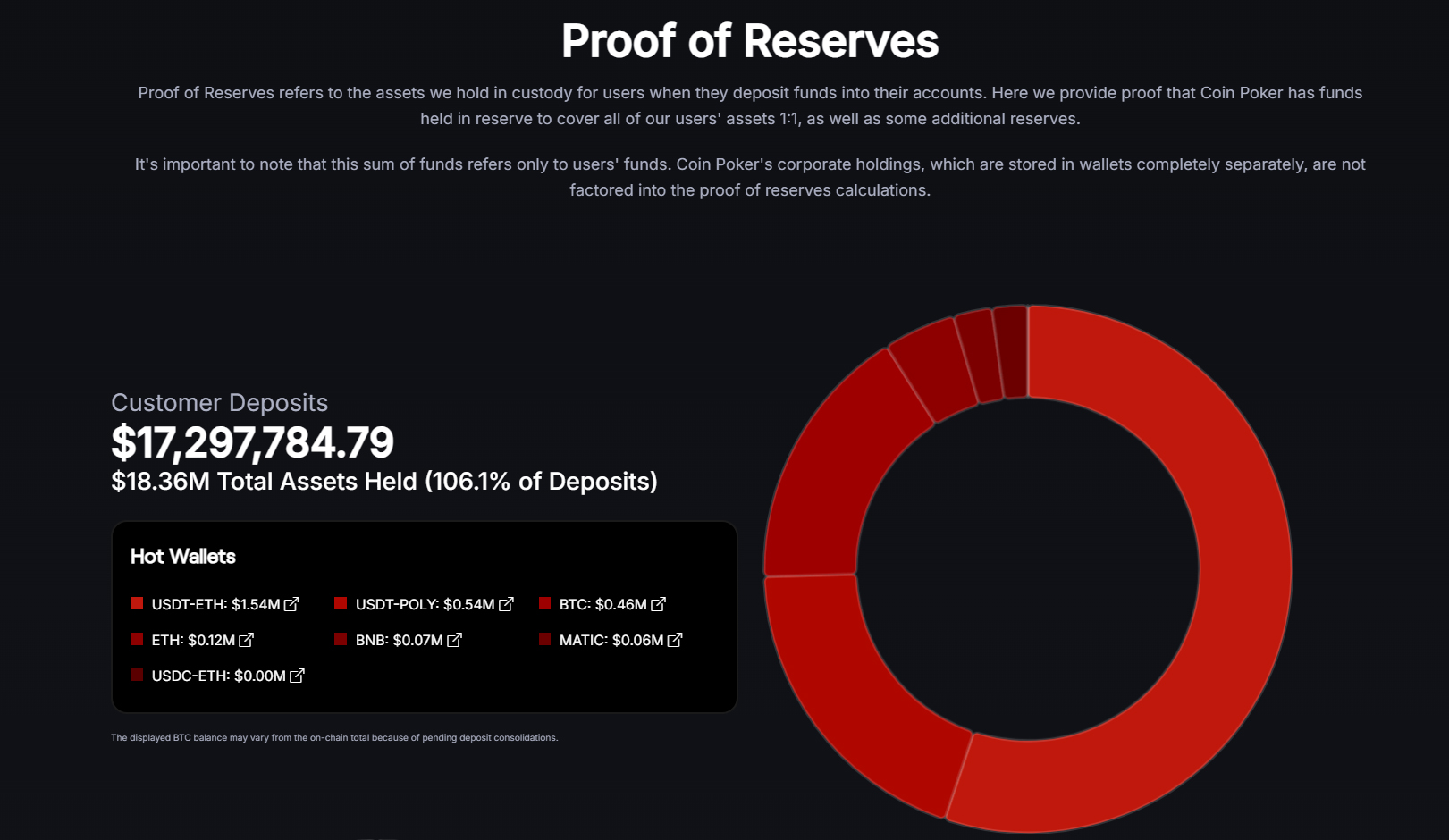 28 июля 2024 года на сайте CoinPoker появился уникальный раздел — Proof of Reserves (доказательство резервов), в котором размещена вся информация об активах румах. Там можно проверить все адреса хранения, при этом страница регулярно обновляется.