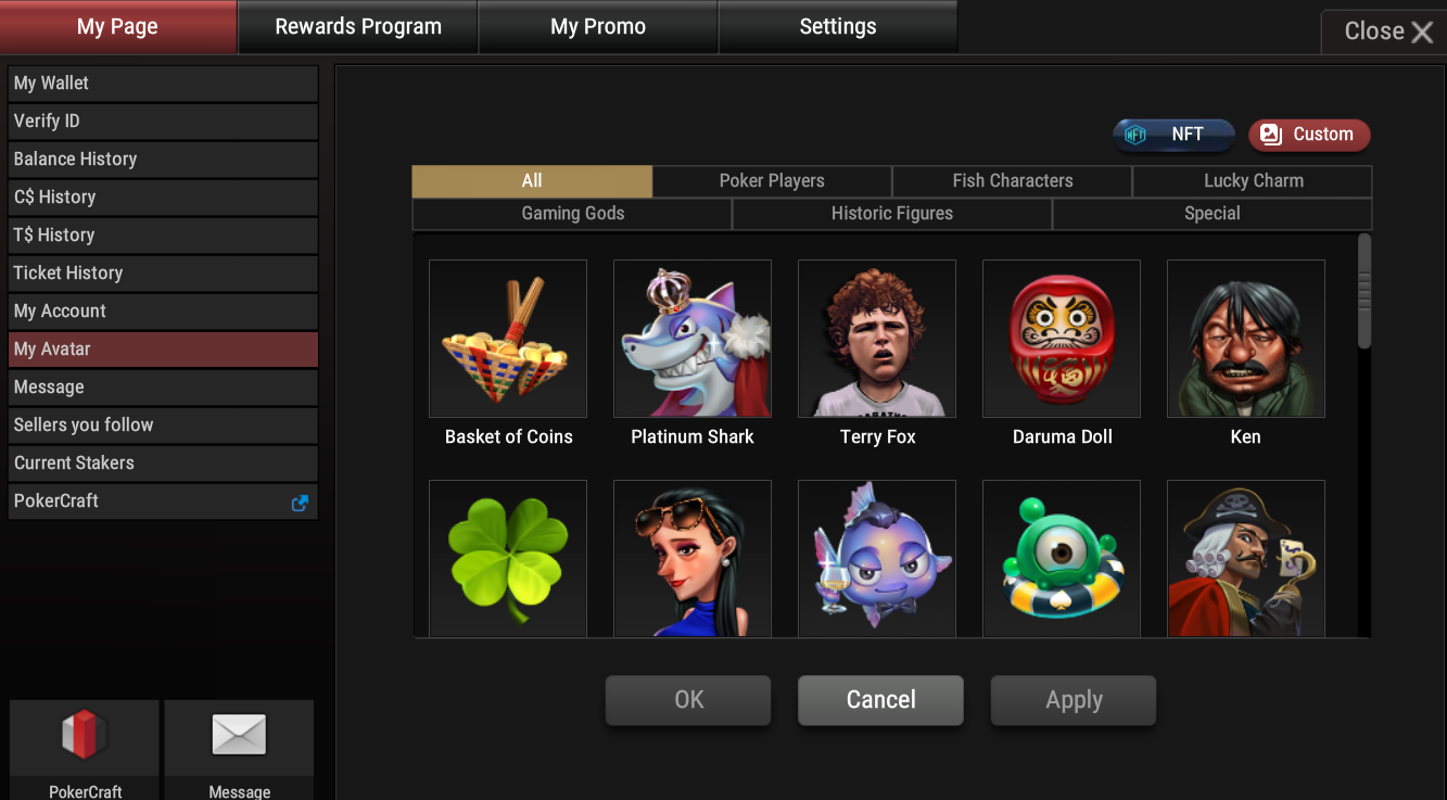 Чтобы сделать это, зайдите в настройки PokerOK —> вкладка «My Page» —> раздел «My Avatar». Найдите справа над аватарками кнопку NFT.