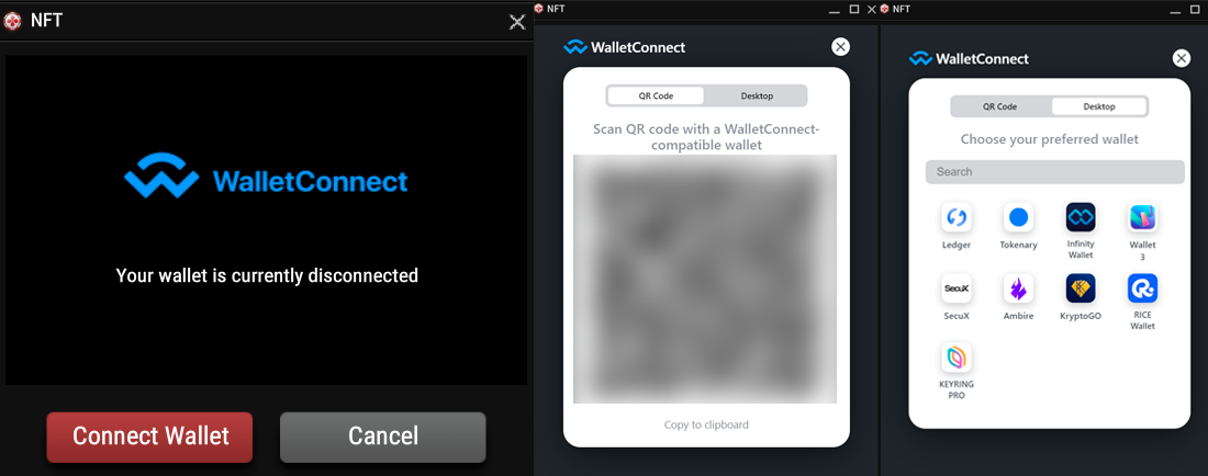 После этого вам нужно будет привязать в руму свой криптовалютный кошелёк — для этого нажмите на кнопку NFT —> в открывшемся окне нажмите на «Connect Wallet» —> отсканируйте QR код через приложение вашего кошелька или выберите доступные кошельки в разделе Desktop. Пока там всего 9 вариантов: Ledger, Tokenary, Infinity Wallet, Wallet 3, SecuX, Ambire, KryptoGO, RICE Wallet и KEYRING PRO.