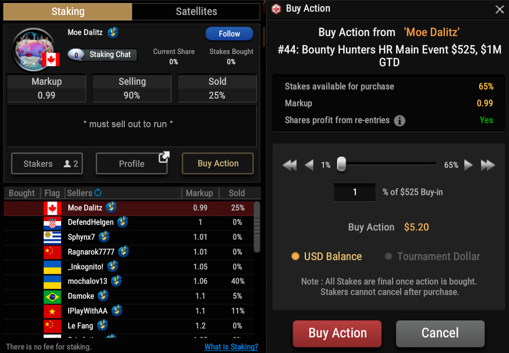 Если стейкинг происходит в турнирах с баунти, то выплаты долей с нокаутов будет производится после окончания турнира для игрока. При этом баунти также будут разделяться с учётом количества входов.