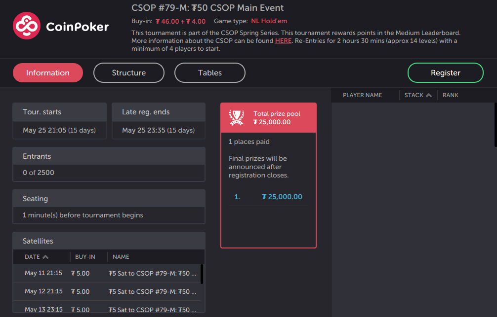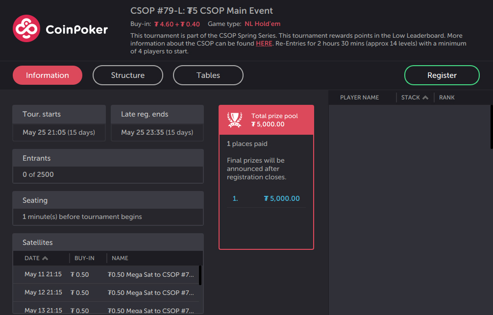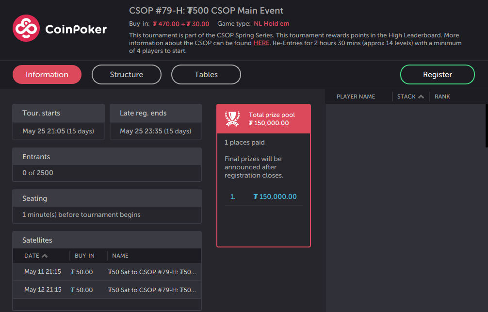 - CSOP Side Event: $1,000 Tuesday PLO Highroller $15K Gtd — старт 13 и 20 мая в 20:15 МСК.
