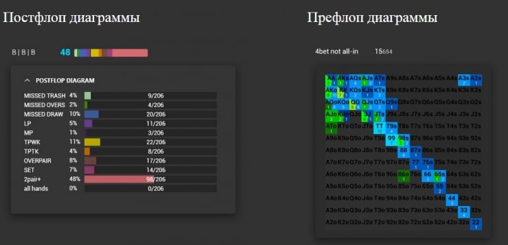 Доступная визуализация огромных объемов статистики – это основной козырь Hand2Note при сравнении с конкурентами. Префлоп- и постфлоп-диаграммы, настройка разделения рук по силе, все это вы сможете использовать в практике.