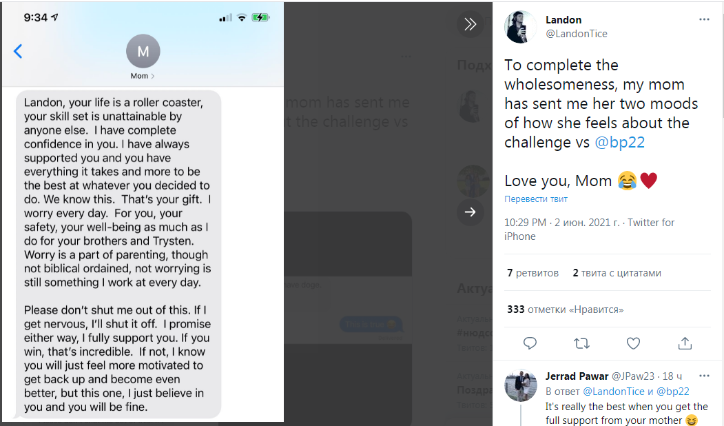 А мама Лэндона Тайса написала очень трогательное сообщение в поддержку сына, которое он выложил в Твиттере непосредственно до начала матча: