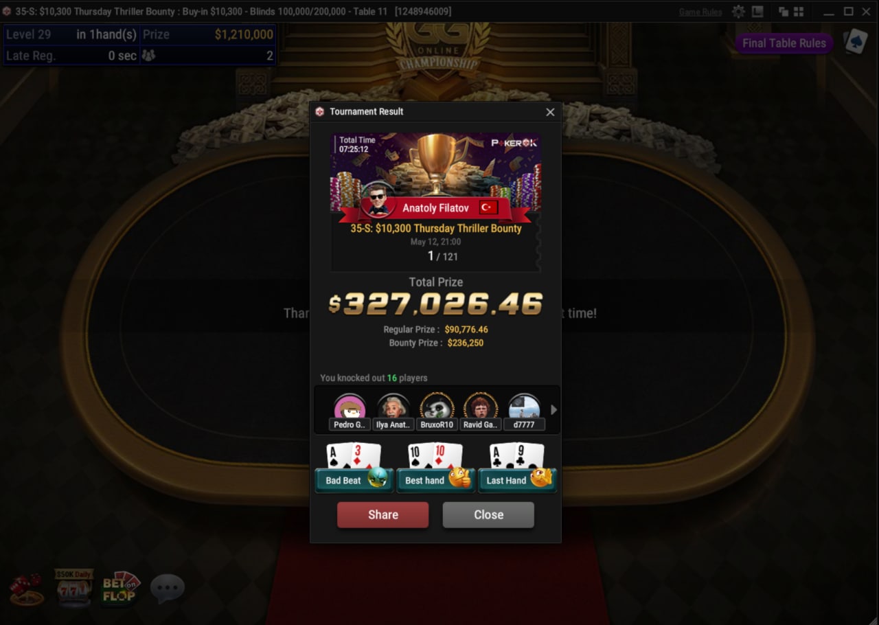 Так написал Анатолий Филатов в своём телеграм-канале после победы в самом дорогом турнире этого четверга (12 мая). Ему покорился $10K Thurday Thriller Bounty, а призовые за первое место составили $327K. При этом амбассадор PokerOK не сделал ни одного ре-энтри.