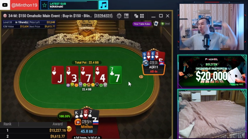 Член команды OmahaSquad Михаил «Minthon» Яковлев празднует занос в событии $150 Omaholic Main Event (призовые $13K). Во время трансляции ему сильно не складывалось: