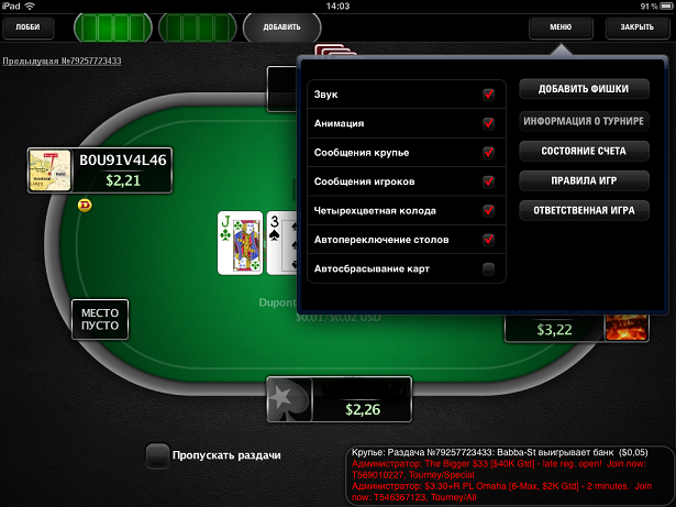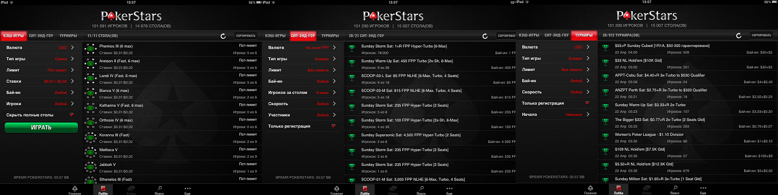 Клиент нам предлагает игры по Холдему и Омахе, кэш и турниры, к сожалению нету ZOOM, который особенно бы смотрелся на мобильном клиенте.