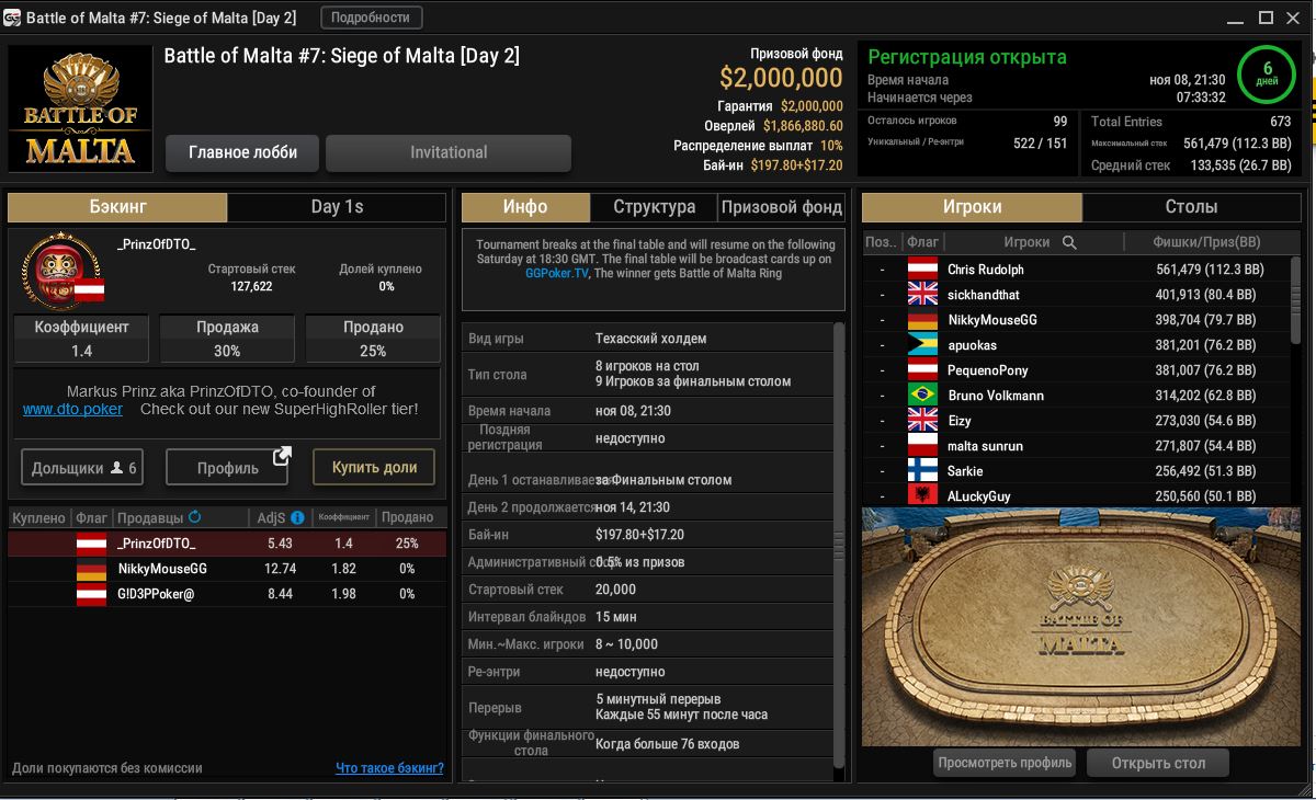 Сегодня в основном расписании Battle of Malta два стартовых дня $215 BoM #7: Siege of Malta в 16:00 и 22:00 МСК. Играть придется 20 уровней по 12 минут. В расписании сайд-ивентов 14 событий с бай-инами от $10,50 до $525. Старт основной загрузки турниров в 18:00 МСК.