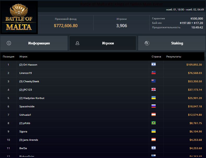 В $215 Battle of Malta #3: Kings of Tallinn Main Event $500K GTD было зарегистрировано 3.906 входов.