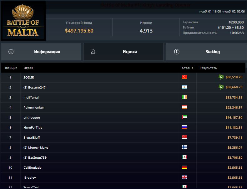 Серия Battle Of Malta Online на GGПОКЕРОК успешно стартовала 1 ноября. В $110 Battle of Malta #1: King's Landing Opener было зарегистрировано 4.913 входов, гарантия в $200K оказалась перекрыта практически в два с половиной раза. Победителями стали «SQDSR» из Китая и «Bostero247» из Аргентины.