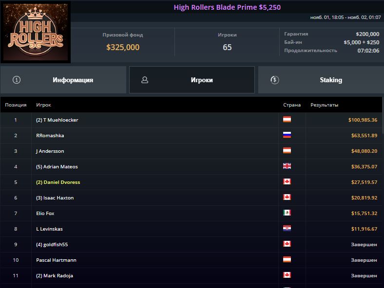 - Томас Мухлокер (Thomas Muhlocker) в турнире $5.250 High Rollers Blade Prime ($100.985
