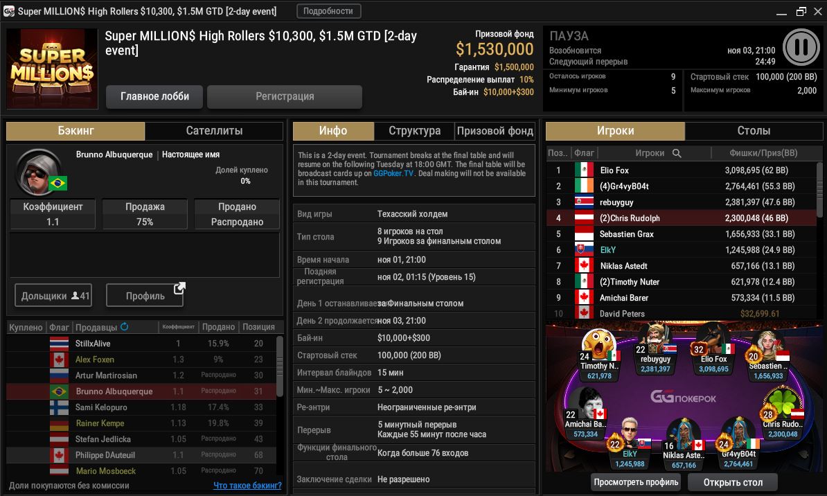 3) вышел за финальный стол $10.300 Super Million$ с четвертым стеком (в компании с Бертраном «ElkY» Гроспелье, и Никласом «lena900» Астедтом).