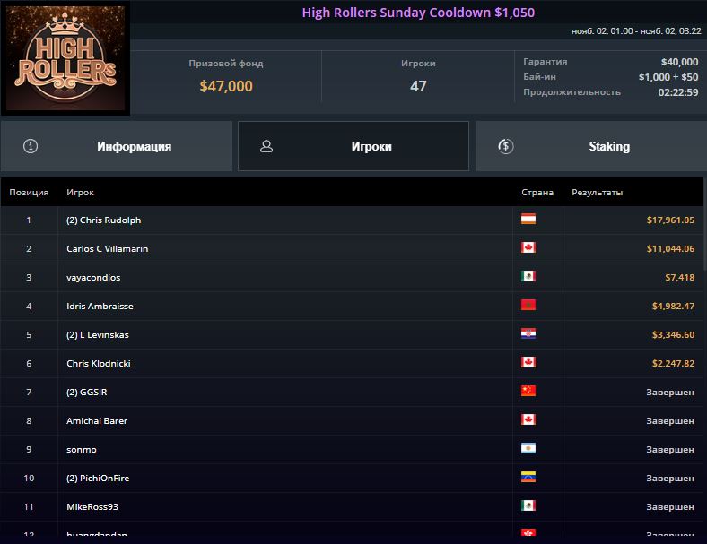 1) выиграл $1.050 High Rollers Sunday Cooldown;