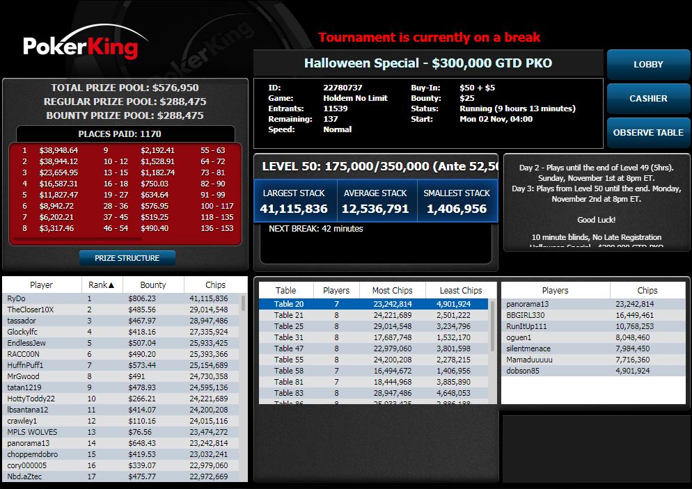 В $55 Halloween Special PKO $300K GTD удалось собрать 11.539 входов. За первое и второе место игроки получат по $39K без учета баунти. Лидирует игрок под ником «RyDo». Турнир возобновится 3 ноября в 04:00 МСК.
