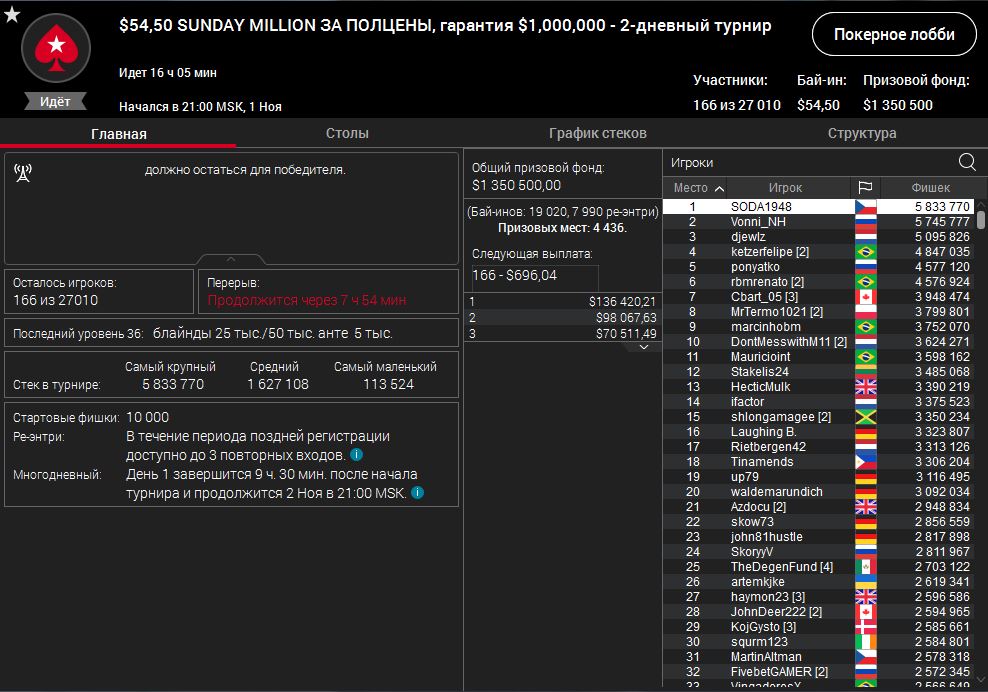 В Sunday Million было зарегистрировано 27.010 входов, в игре осталось 166 человек. Турнир продолжится 2 ноября в 21:00 МСК. После первого игрового дня лидирует игрок из Чехии под ником «SODA1948».