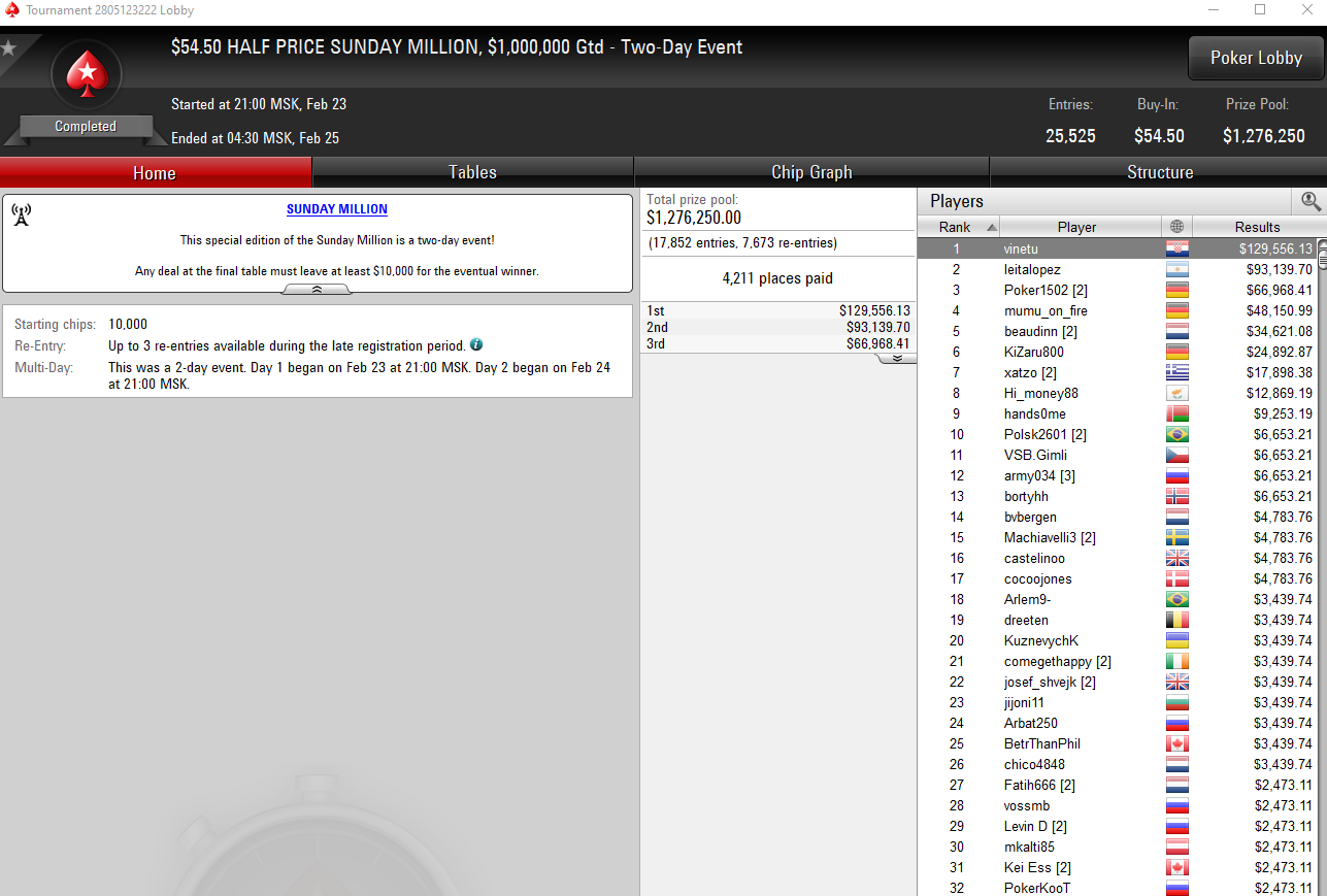 Победитель турнира определился сегодня — им стал хорват под ником vinetu, который обыграл в хедз-апе известного аргентинского регуляра Леандро «leitalopez» Бустильо (Leandro Bustillo).