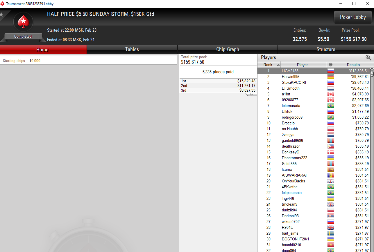 Не настолько оглушительный успех вызвал самый маленький «мейджор» Sunday Storm. Да, он собрал более 32,000 участников, но гарантию $150,000 перебили всего лишь на $9600.