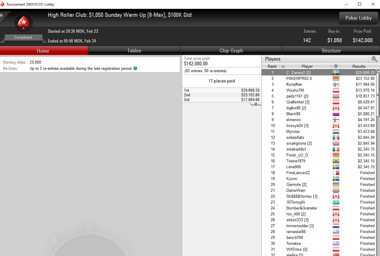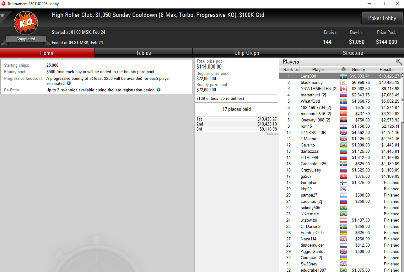 Действующий топ-1 МТТшник по версии портала Pocket Fives Никлас Астедт (Nicklas Astedt) победил в хайроллерской зарубе за $1050. Его призовые составили $13,426 + $19,093 в виде баунти. На финальном столе с ним также оказались двое россиян, одним из которых был Артур «marathur1» Мартиросян.