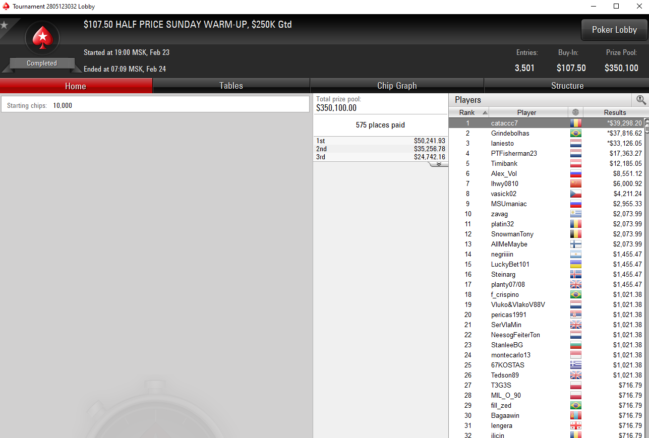 Разогревочный варм-ап собрал 3501 вход и перебил гарантию $250K. Самый крупный приз $39,298 по результатам сделки в 3-максе забрал румын под ником cataccc7.