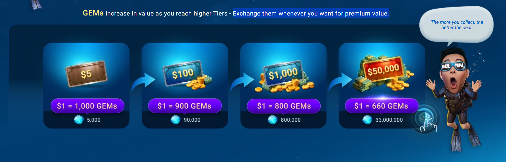 Во-вторых, Ocean Rewards даёт игрокам GEMs — какие-то гемы, которые используются для обмена на награды в любое время. На момент анонса новой программы лояльности описание этих гемов минимальное — буквально одна строка с этой картинкой.