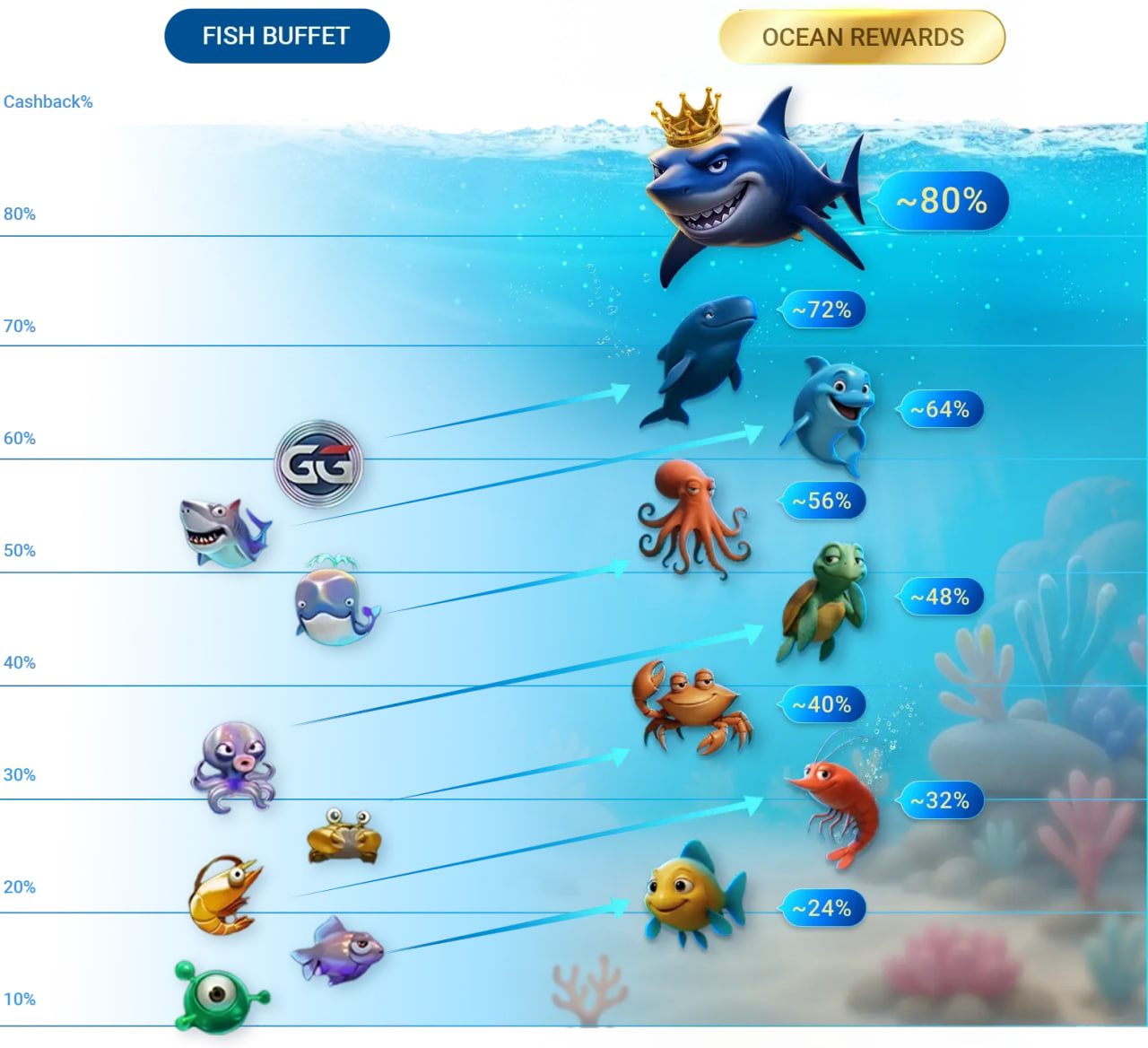- Fish Buffet — до 60% рейкбека, Ocean Rewards — до 80%.