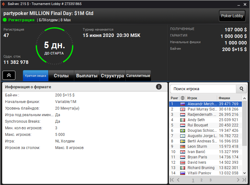 Раньше игроки могли выбирать любой из многочисленных первых входных дней. Проход в финальный день можно было выиграть в фазах по $2.20. Сейчас partypoker вернулись к истокам и переделали систему в более простой формат. Путевку в любой из 7 входных дней за $215 можно выиграть в старых добрых сателлитах за $22. А в 22-ушку — в более дешевых отборах за $2.20.