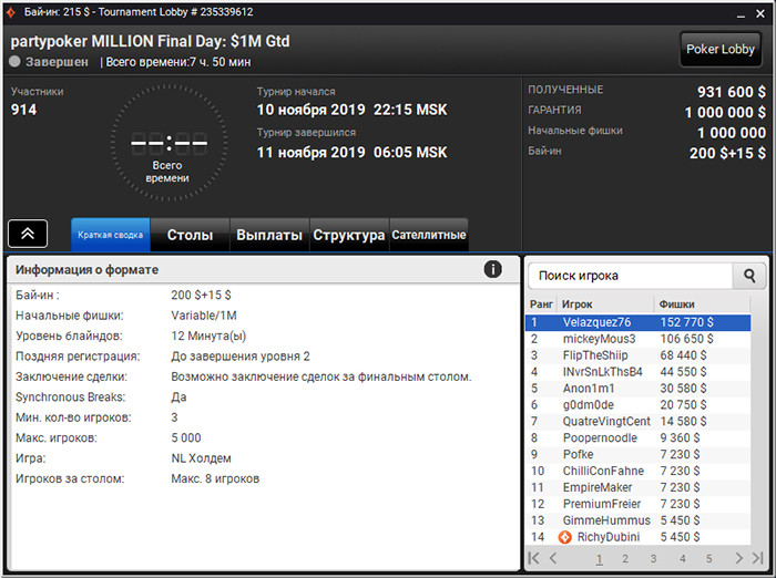 Спустя две недели турнир все же состоялся. Первым чемпионом partypoker MILLION стал британский профессионал под ником Velazquez76. Он забрал $152.770 призовых и билет стоимостью $10,300 на предстоящий MILLIONS Online с гарантией $20,000,000.