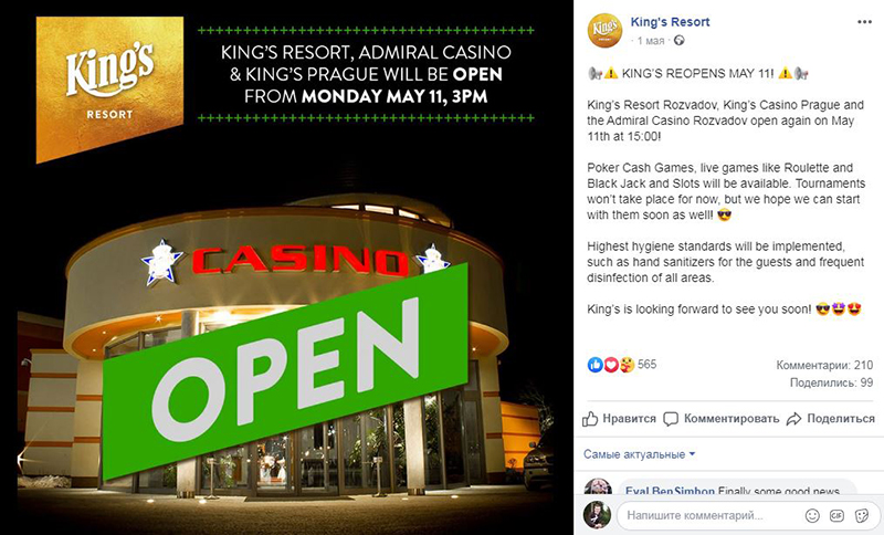 На странице в Facebook «King’s Resort» анонсировали дату, когда посетители вновь смогут погрузиться в мир покера и азартных игр. King’s Resort Rozvadov, King’s Casino Prague и Admiral Casino Rozvadov откроются 11 мая в 16:00 МСК. Игрокам будут доступны игры казино (рулетка, блэкджек, слоты) и покер, но только в формате кэш-игр. С турнирами пока придется подождать.