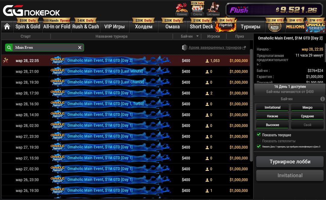 GGПОКЕРОК стали первыми, кто решил провести крупную серию по Омахе. Дополнительной критики сеть получила за формат NL Postflop. Но, несмотря на все злые языки, серия проходит очень успешно. Дорогие турниры практически без оверлеев, гарантии перебиваются в полтора раза. Изредка встречаются оверлеи в турнирах с низкими бай-инами до $21.