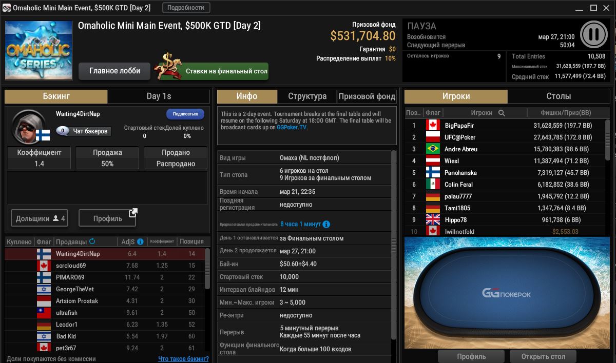 В $55 Mini Main Event 10,508 регистраций, гарантия побита на $31K. Финальный стол будут доигрывать 27 марта в 21:00 МСК со стримом на YouTube.