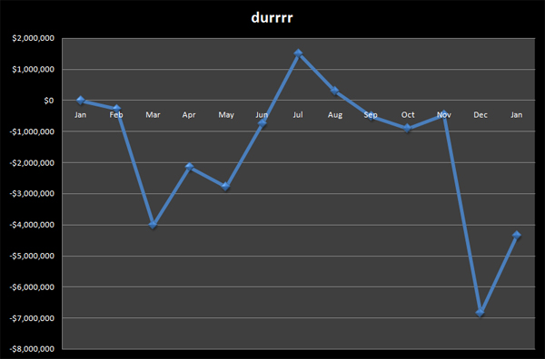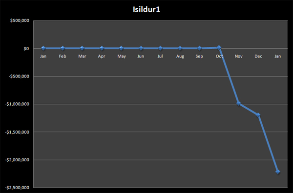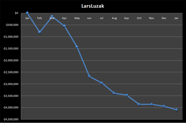 Мы собрали всю информацию о Isildur1 в специальном сообществе, где ее можно удобно изучить, но итоговый график шведа удивит даже тех, кто следил за игрой Isildur1 регулярно. Мы постоянно писали о всех достижениях шведа, и многих удивляли его резкие свинги, но на графике с месячной градацией, Isildur1 фактически не поднимался в плюс. Вся причина в том, что профит шведа (а в пике он достигал пяти миллионов долларов), был проигран им до окончания месяца, и соответственно, к началу следующего месяца Isildur1 уже подходил с отрицательным результатом.