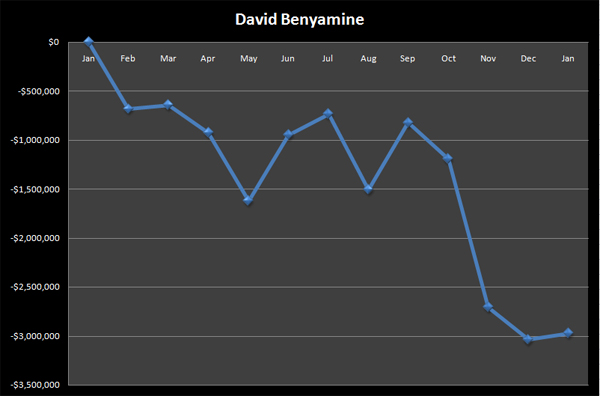 Четвертое место занял известный кеш игрок Девид Беньямин (David Benyamine), в прошлом году занимавший место в топе самых плюсовых игроков. Девид выиграл в 2008 году более 3 миллионов долларов онлайн, и что, скорее всего, является лишь частью реального профита, так как основная специализация Беньямина оффлайн кеш. Так же, прошлый год стал счастливым для Девида и по причине обручения с очаровательной Эрикой Шоенберг (Erica Schoenberg). Тем не менее, из-за финансового спора с Full Tilt Poker, Девид потерял статус “красного про” в комнате, и начал 2009 год под ником “MR B 2 U SON”, который оказался не слишком счастливым. В июле Девид вернул себе статус и вновь стал играть под своим основным аккаунтом, после чего в его игре наметился прогресс и он практически выбрался из минусовой зоны, но с сентября наметился очередной спад и к декабрю Девид подошел с минусом в три миллиона долларов. Год завершился для Девида Беньямина с минусом в 2,9 миллиона долларов, а так же слухами о прекращении отношений с Эрикой Шоенберг.