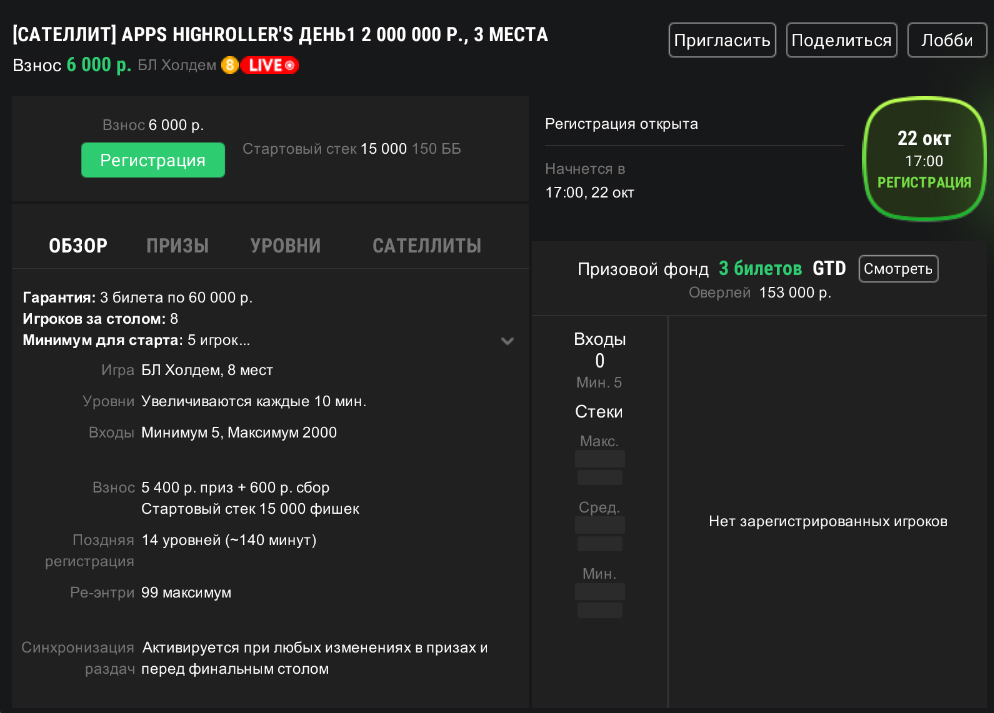 - ₽6К Сателлит: воскресенье — в 17:00 МСК. Гарантия — 3 билета в ₽60К Highroller’s.