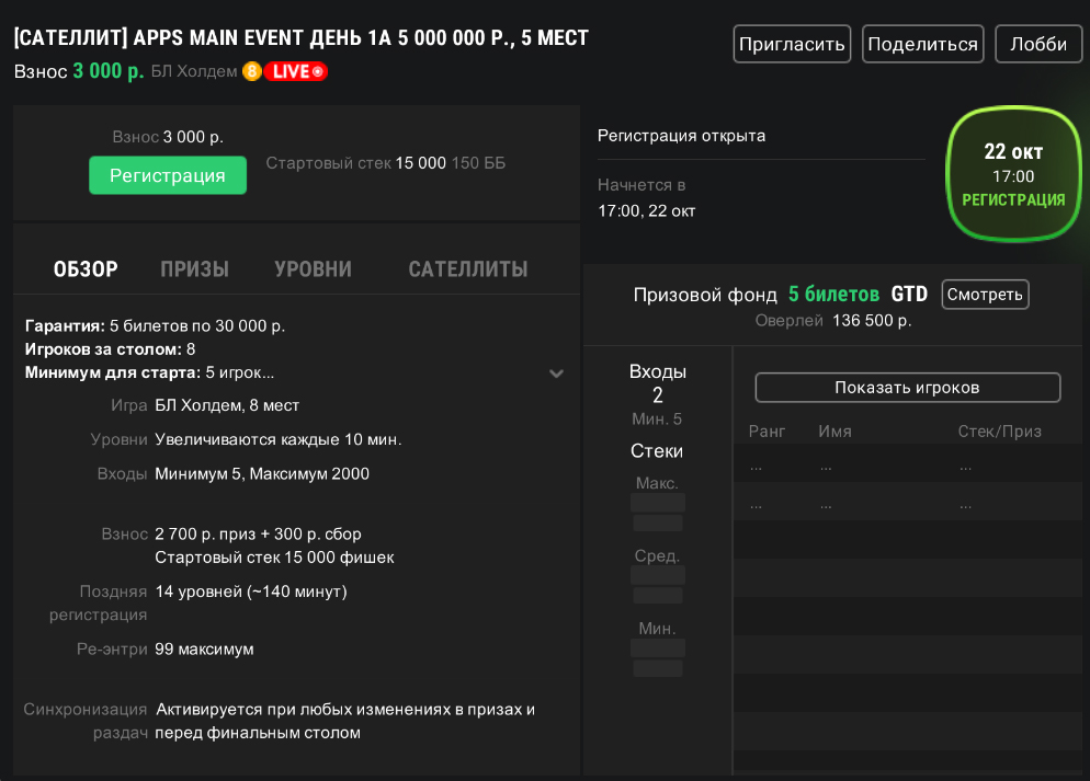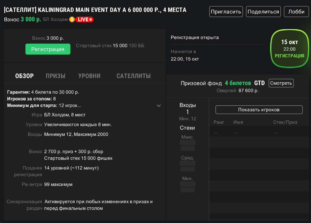 - ₽3К Сателлит: воскресенье — в 22:00 МСК. Гарантия — 4 билета в ₽30К Main Event.