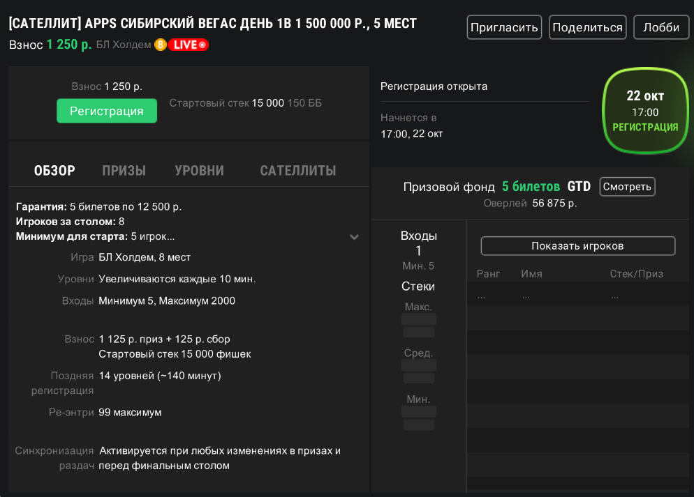 - ₽1,250 Сателлит: воскресенье — в 17:00 МСК. Гарантия — 5 билета в ₽12,5К Сибирский Вегас.