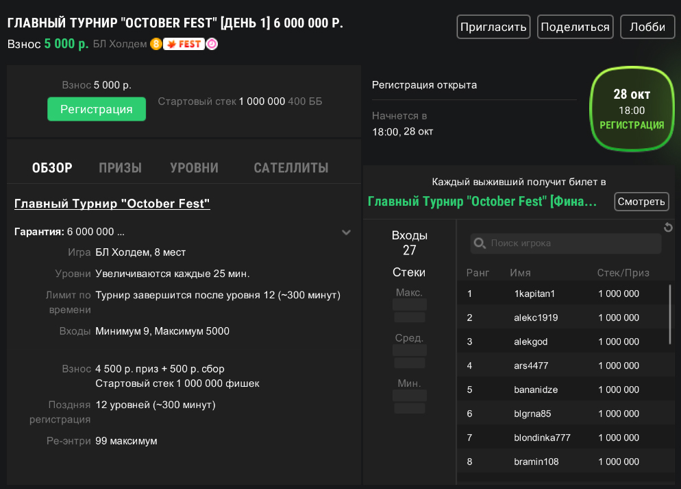 День 1 ₽5К Главный Турнир “October Fest” ₽6M Gtd стартует 28 октября в 18:00 МСК и продлится 12 уровней по 25 минут. Игра возобновится на следующий день в то же время.