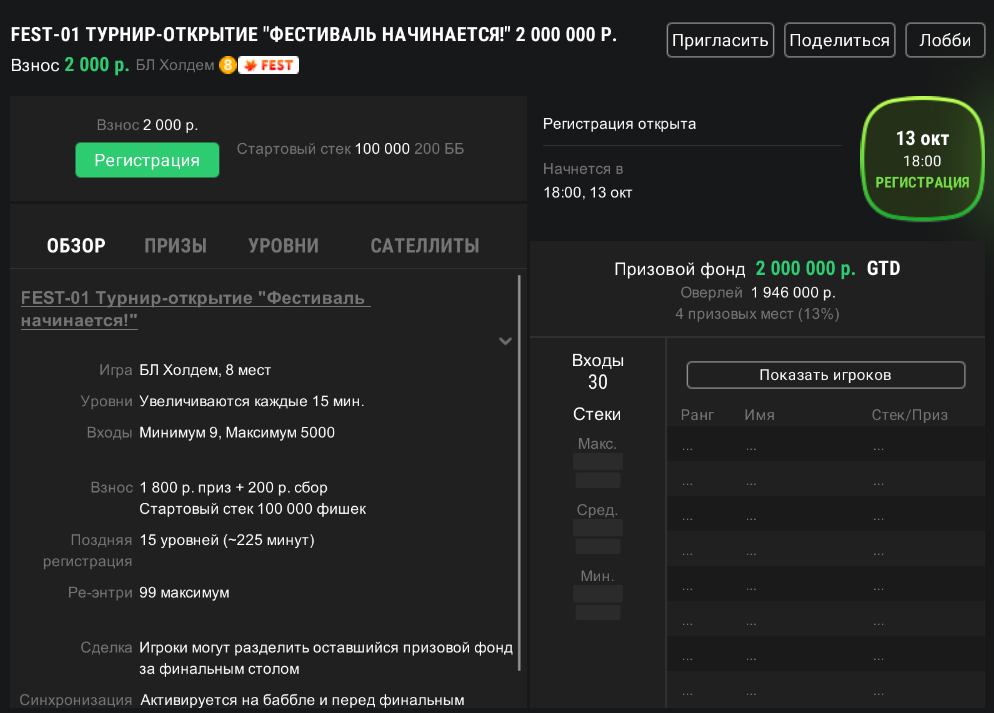 Откроет серию ₽2К FEST-01 Турнир-открытие “Фестиваль начинается!” с гарантией ₽2,000,000 — он начнётся 13 октября в 18:00 МСК.