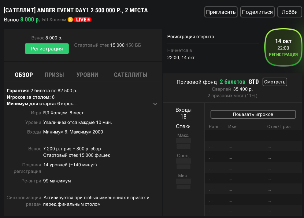 - ₽8К Сателлит: суббота — в 22:00 МСК. Гарантия — 2 билета в ₽82,5К Amber Event.