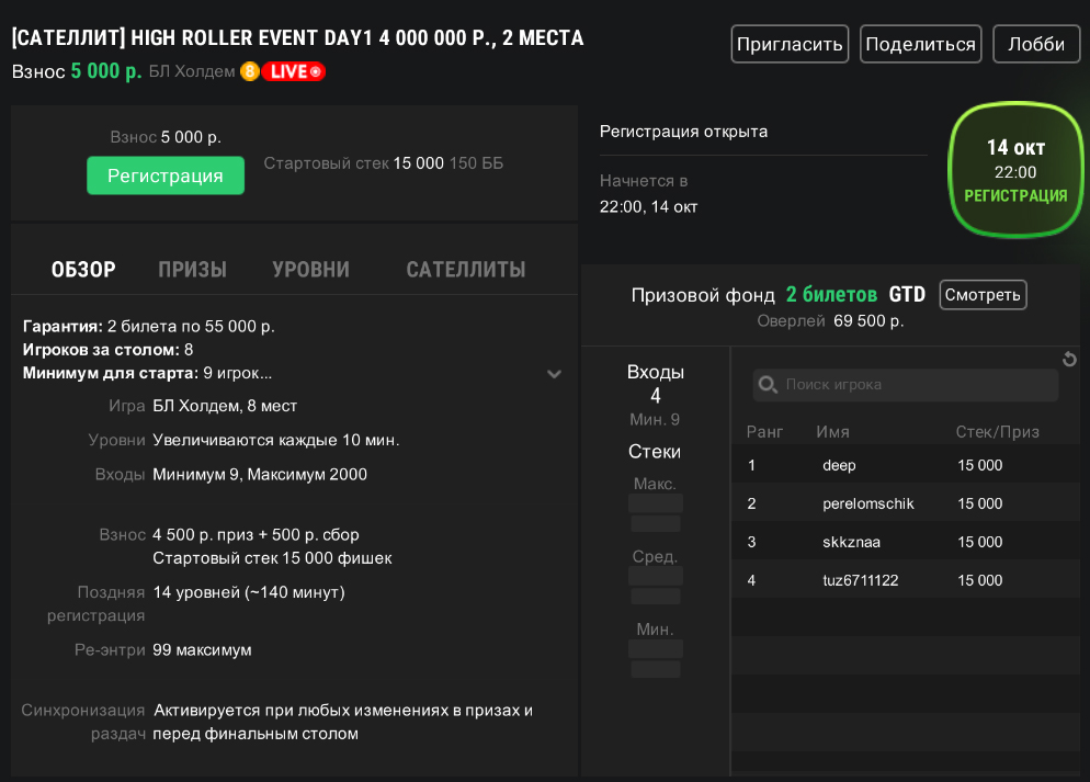 - ₽5К Сателлит: суббота — в 22:00 МСК. Гарантия — 2 билета в ₽55К High Roller Event.