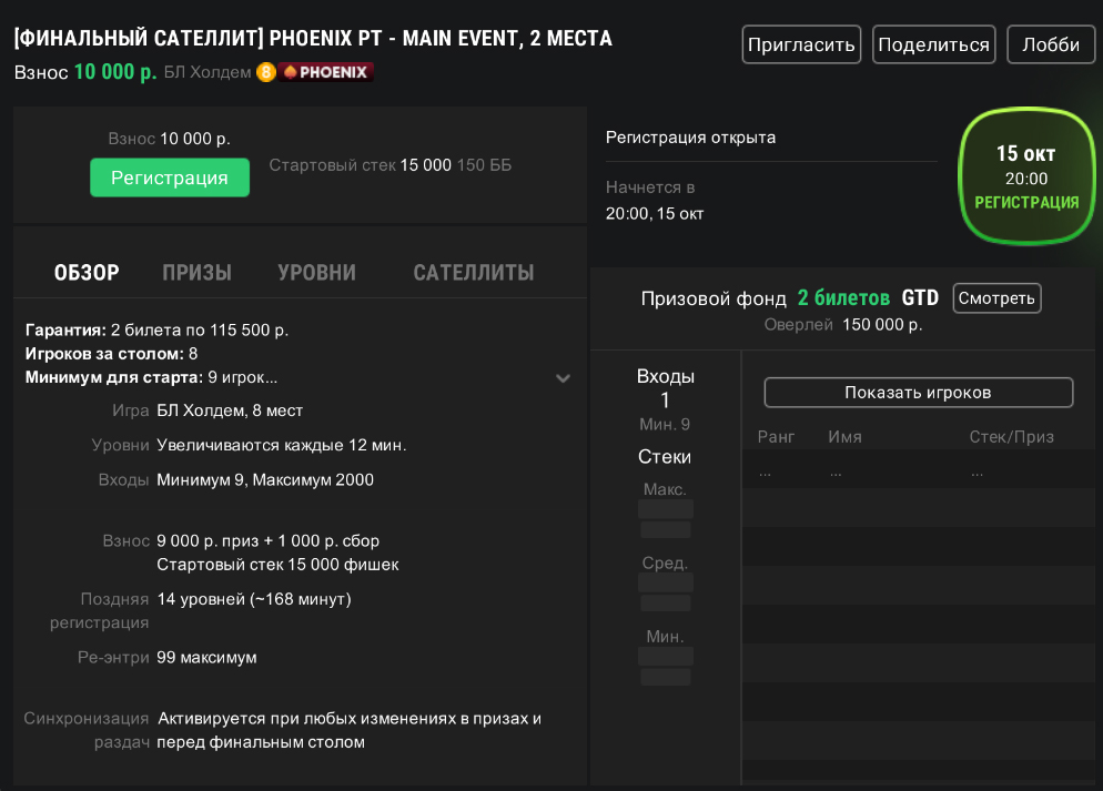- ₽10К Финальный Сателлит: старт — по воскресеньям в 20:00 МСК. Гарантия — 2 билета в ₽115,5К Main Event.