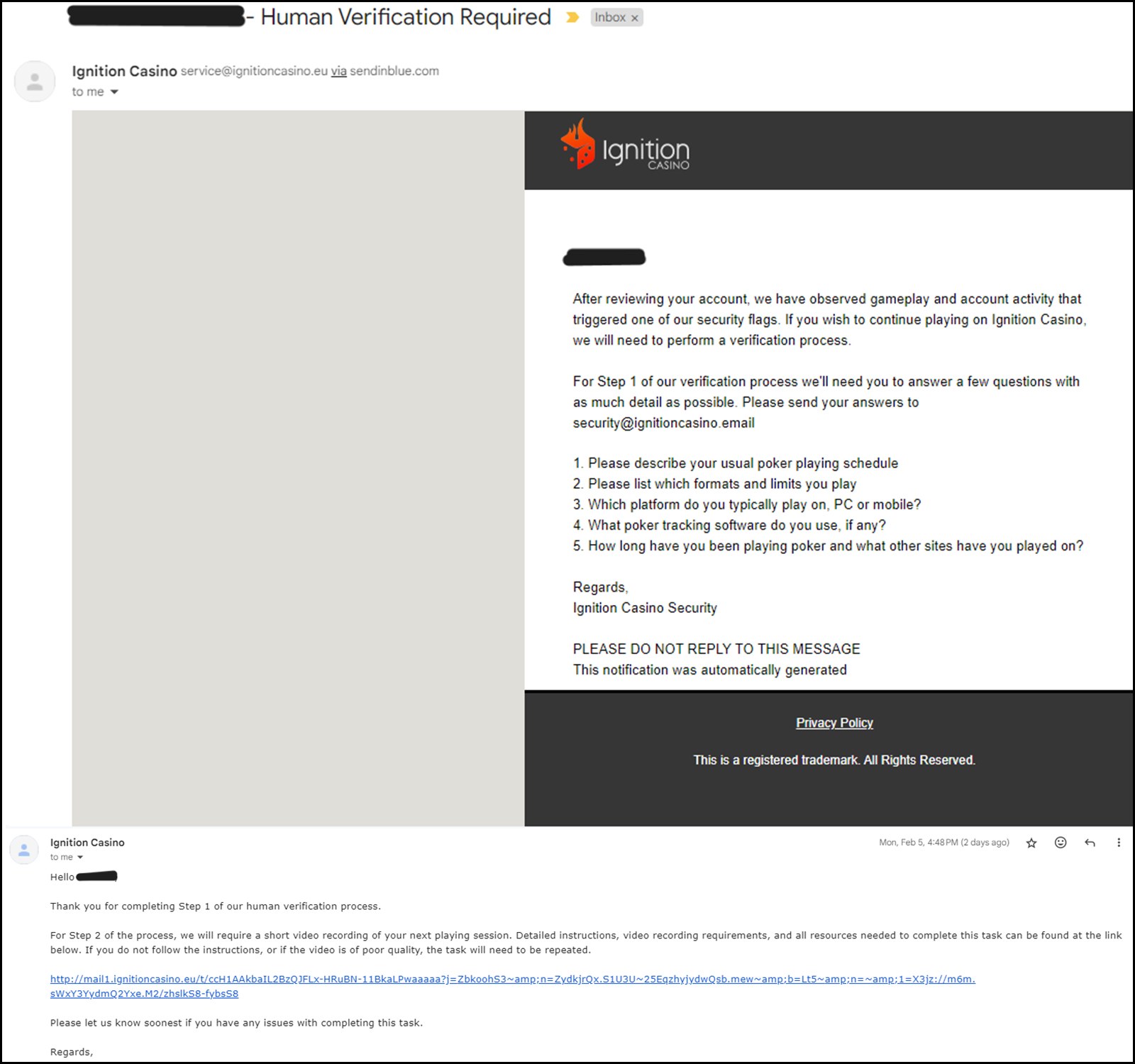 Для англоязычных же в этой роли выступают рум Ignition Poker и платёжная система PayPal. Пример на скриншоте ниже — это фишинговое письмо, которое получил Патрик Ховард.