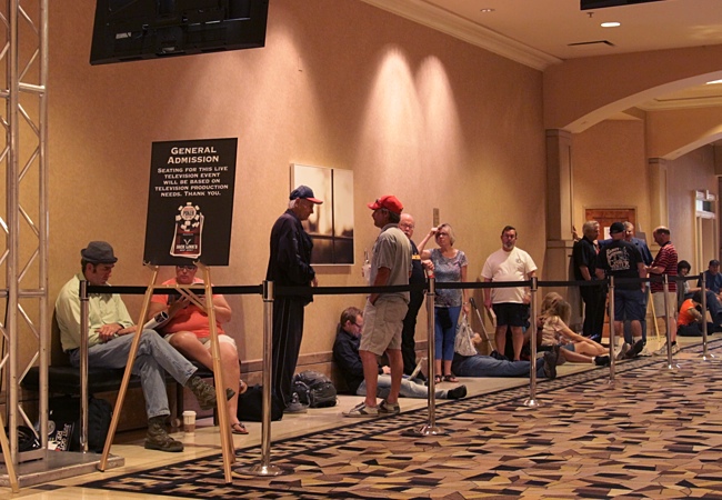 Официальное начало финалки - 16:45, но зрители начали занимать очередь еще в час дня. Тем, кто придет первым, был обещан бесплатный вход и лучшие места. Нет, лучшие все-таки должны были достаться друзьям и членам семей игроков, но все-таки... Напротив был бар, для ожидающих поставили несколько скамеек, людям было чем занять себя, тем более что ближайшие несколько часов не происходило ровным счетом ничего, а вход в Penn & Teller theater были еще плотно закрыты решетками.