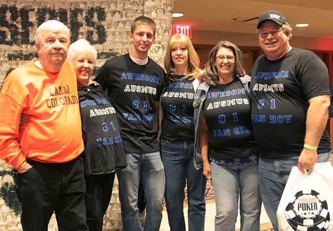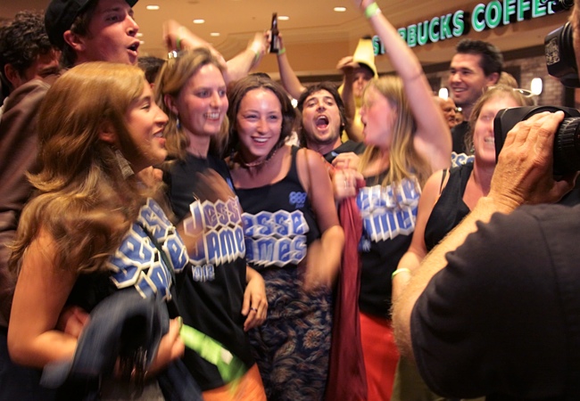 К двум к полю боя возникли первые члены команд поддержки - чиплидера Джесси Сильвиа (все в синем с крупной надписью на груди “Jesse James”, хоть и без четверок, как в его нике на PokerStars) и Майкла Эспозито (тоже в синем, с ирландским листком и транспарантами “Way to go, Espo!”). Потрясли друг перед другом заготовленными к финалке плакатами, покричали свои боевые речевки, - и перешли к братанию.