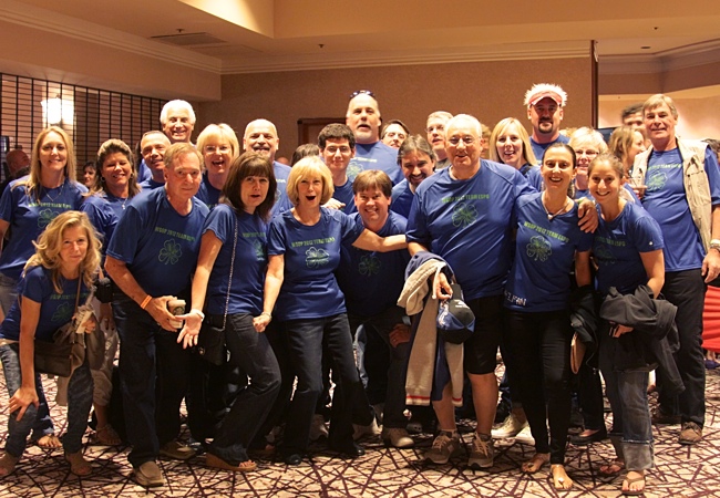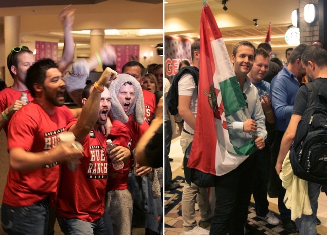 Ну, а к 14:30, когда началась официальная аккредитация, у Penn & Teller theater было уже не протолкнуться. Подтянулись фаны Роба Салабру - все в красных футболках за исключением черной макаки и человека-банана... Эти ребята из “Team Salaburu” хорошенько прочистили глотки перед входом в зал, легко заткнув за пояс “синих”.