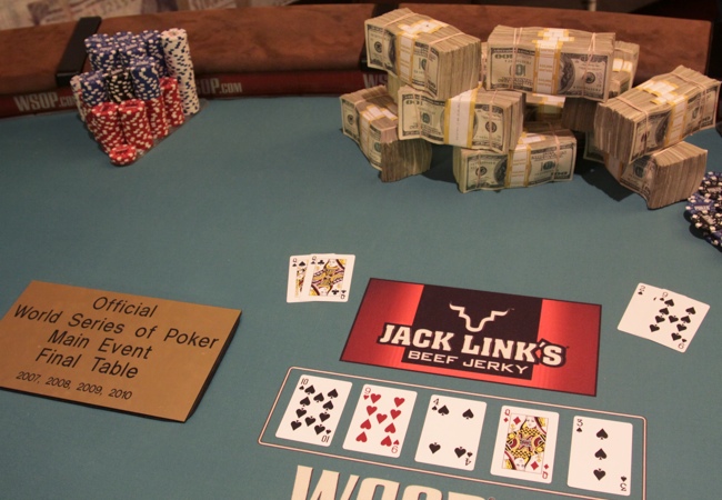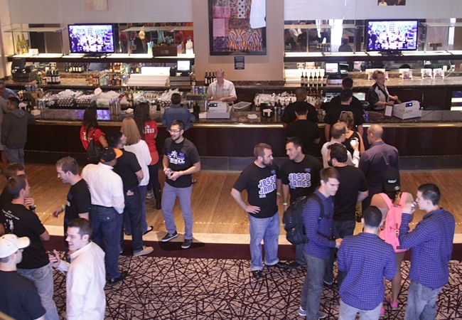 Penn & Teller - отличное место для финала. Большой, просторный, с тремя ярусами лож. В его холл перекочевала вся наглядная агитация WSOP: портреты чемпионов, неоновые эмблемы и старинный финальный стол с прибитыми с приклеенными к нему картами и пожелтевшими пачками стодолларовых купюр. Там же был магазинчик с атрибутикой (к финалке выпустили специальные футболки, кепки и худи) и большой бар, к которому сразу выстроились длинные очереди: пиво, водка, виски, соки...