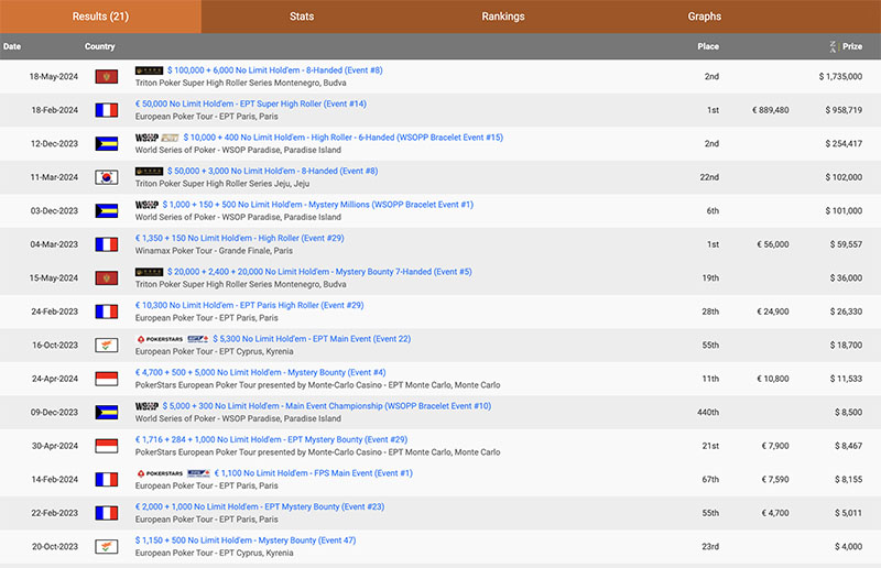 Мне потребовалось много времени, чтобы выбраться на свой первый офлайн-турнир. Первый офлайн турнир я сыграл на Winamax Poker Open Madrid 2022. На этой серии я даже в деньги не попал. Затем поехал на WSOPC Marrackech в 2023 году — в одном из турниров я облажался со ставкой на префлопе, перепутал цвет фишки и вместо 1/4 стека поставил 3/4.