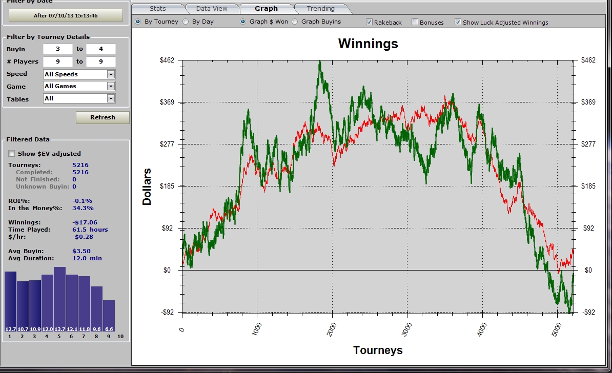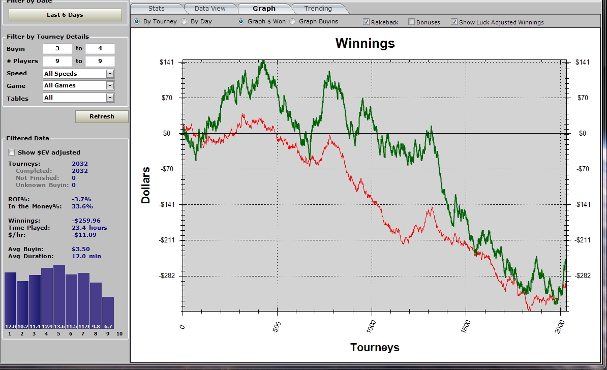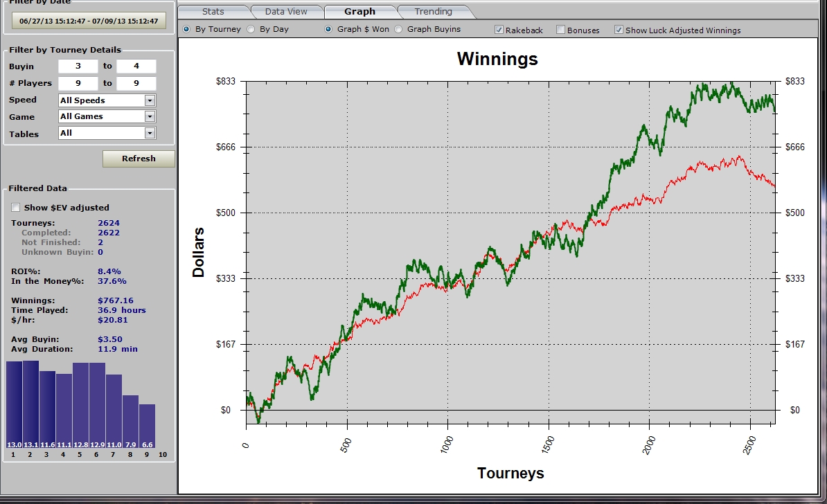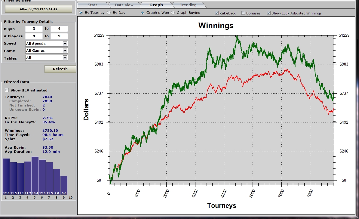 После этого я по сути был свободен и единственное, что мне оставалось-катать. Ну и конечно магистратура, я же решил продолжить обучение, поэтому меня ждали экзамены ... снова. Но о них можно было не думать до середины месяца. Сначала я на 10 дней оказываюсь в пустой квартире моего дяди, который поехал с женой на море. Поскольку таскать за собой огромную панель 24 дюйма было непрактично, я был вынужден играть на 15" экране ноутбука, который ко всему не отличается качественной цветопередачей. Но хрен с ним, хорошо хоть такой есть. Всего катал я каскадом 24+ стола. Как оказалось это очень удобно, я не вижу, как меня переежають, полностью сосредоточен на активном окне и по сути единственной проблемой тогда была необходимость контролировать количество столов, потому что на тот момент у меня не было программы для авторегистрации. Результаты за период с 27.06 до 9.07: