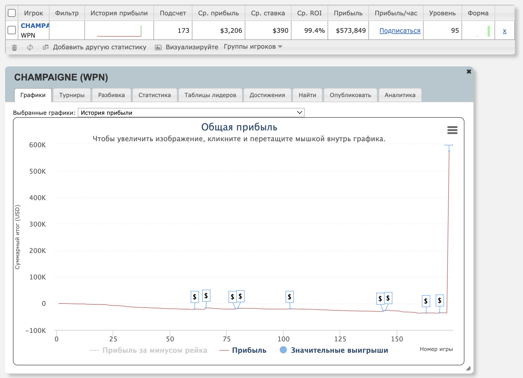 До этого турнира CHAMPAIGNE отыграл на PokerKing 172 турнира в -$36K.